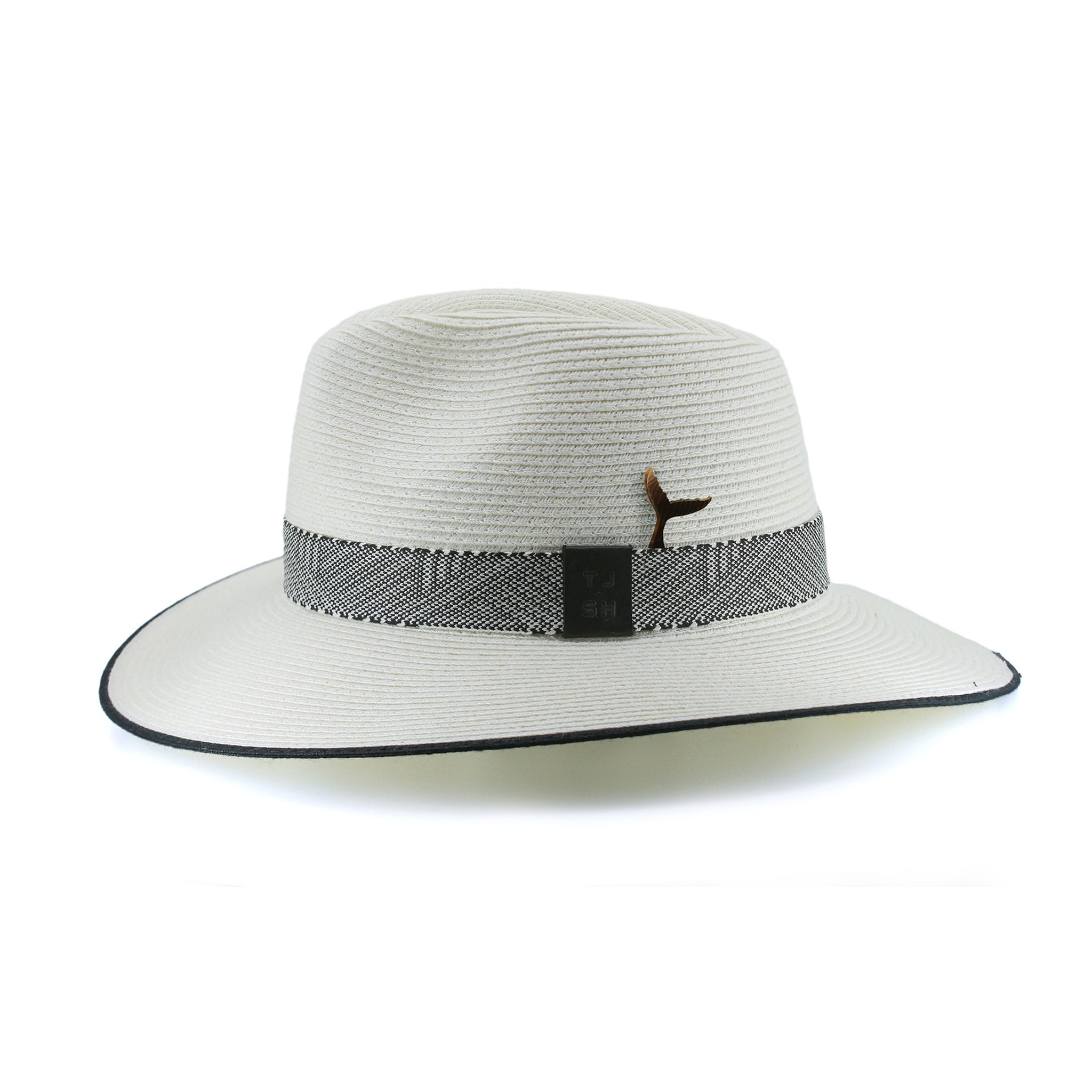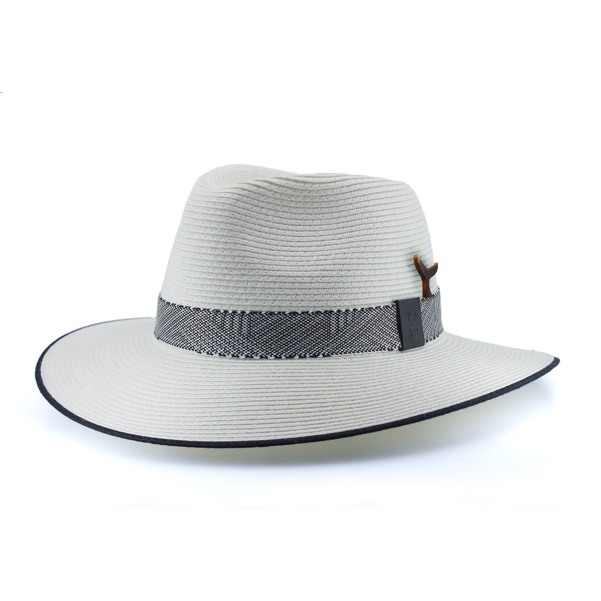 In classic contemporary Ivory and Black, the URBAN EXPLORER is an easy-to-wear Flexibraid® Fedora featuring a textured, tonal woven headband and finished with a leather loop, stamped with the TJSH logo. The brim is edged in black. This is a great travel hat which can be styled with many outfits. ComfyFit internal adjuster. UPF50+. Proudly Australian made.