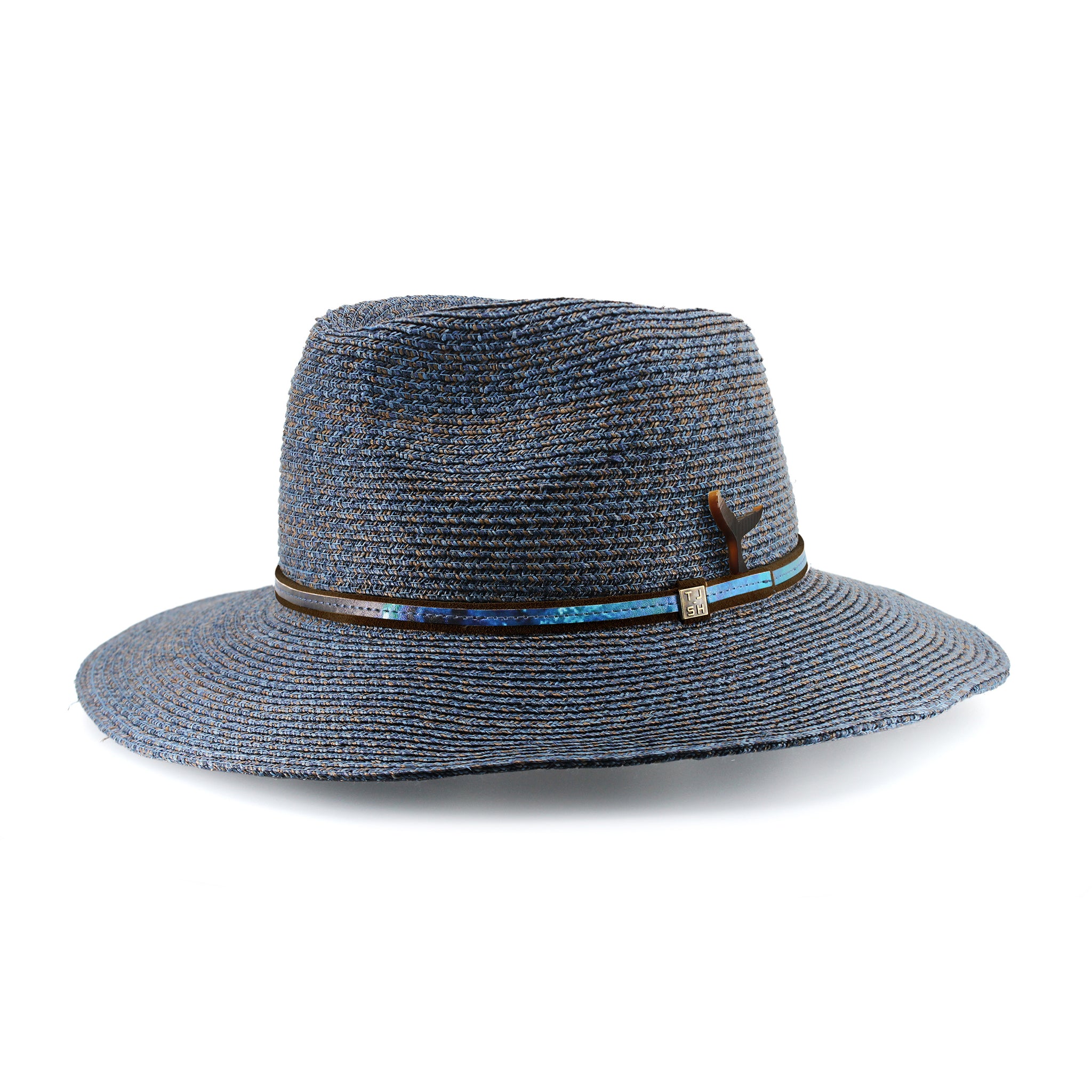 Wrapping elegantly around the crown of the BALMORAL RESCUE, is a slim detail from Tim Johnston’s painting, Balmoral. Mounted on a solid, brown leather band which adorns the mixed navy Raffia-braid Fedora and finished with a signature TJSH stud. A wired brim edge allows this signature TJSH hat to be formed into a cowboy shape or a simple wide brim Fedora. ComfyFit internal adjuster. UPF50+. Proudly Australian made.